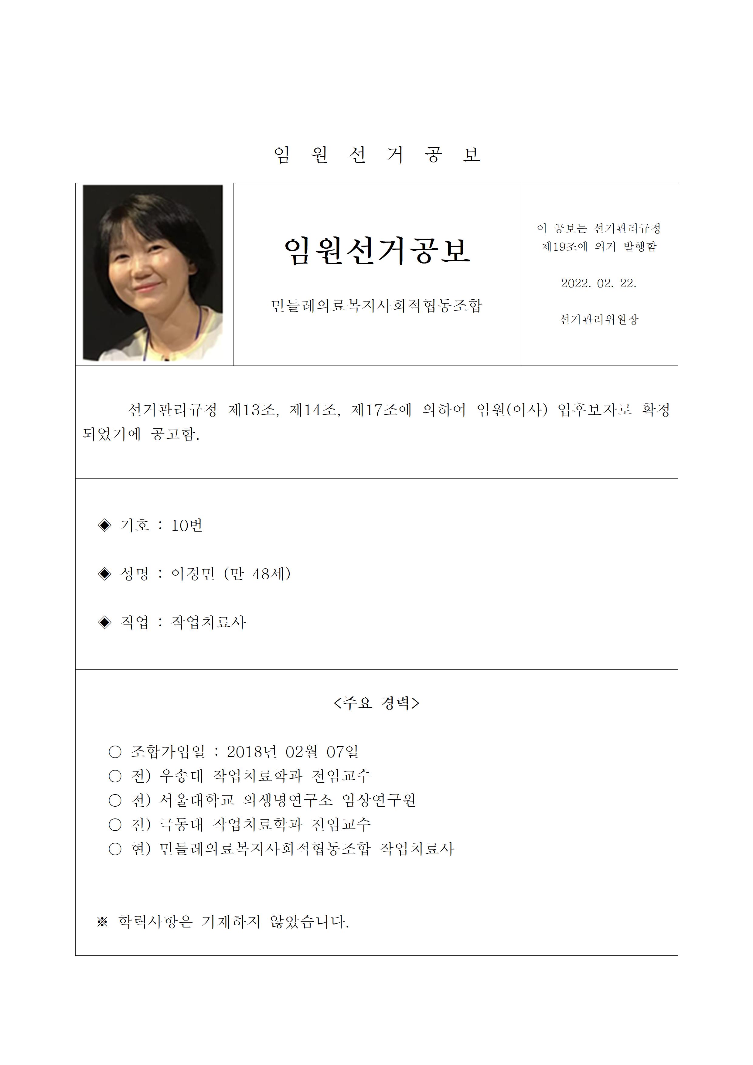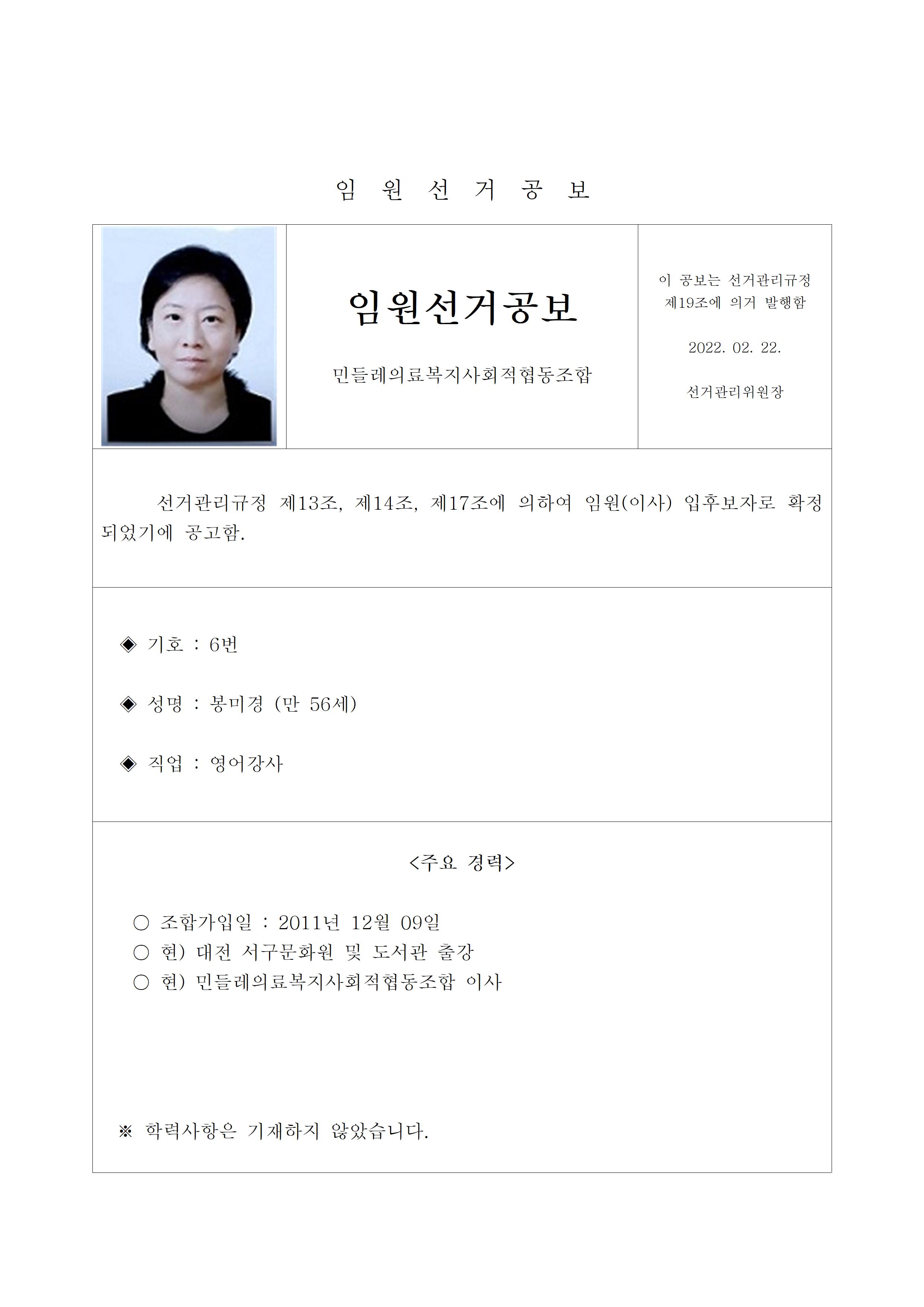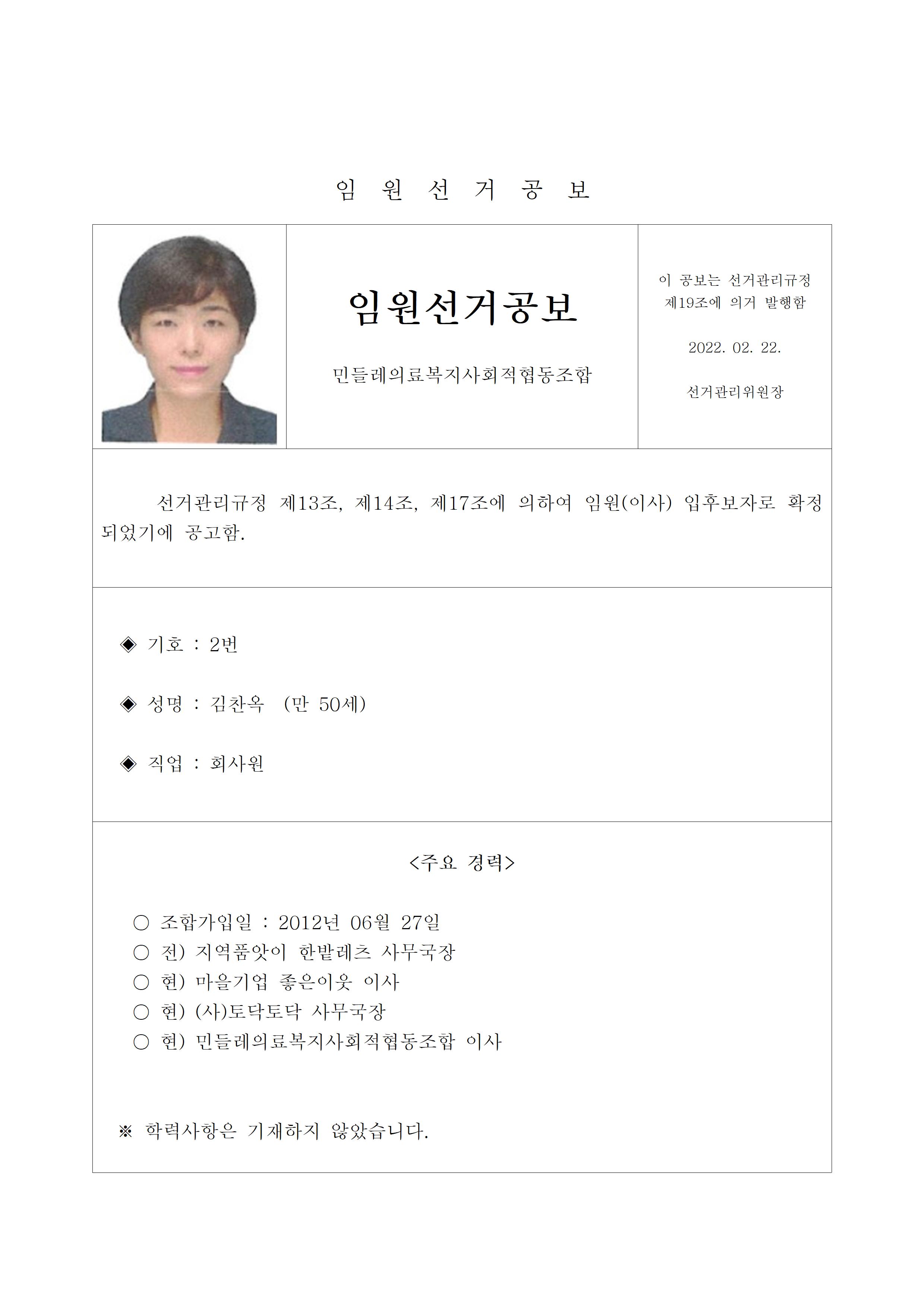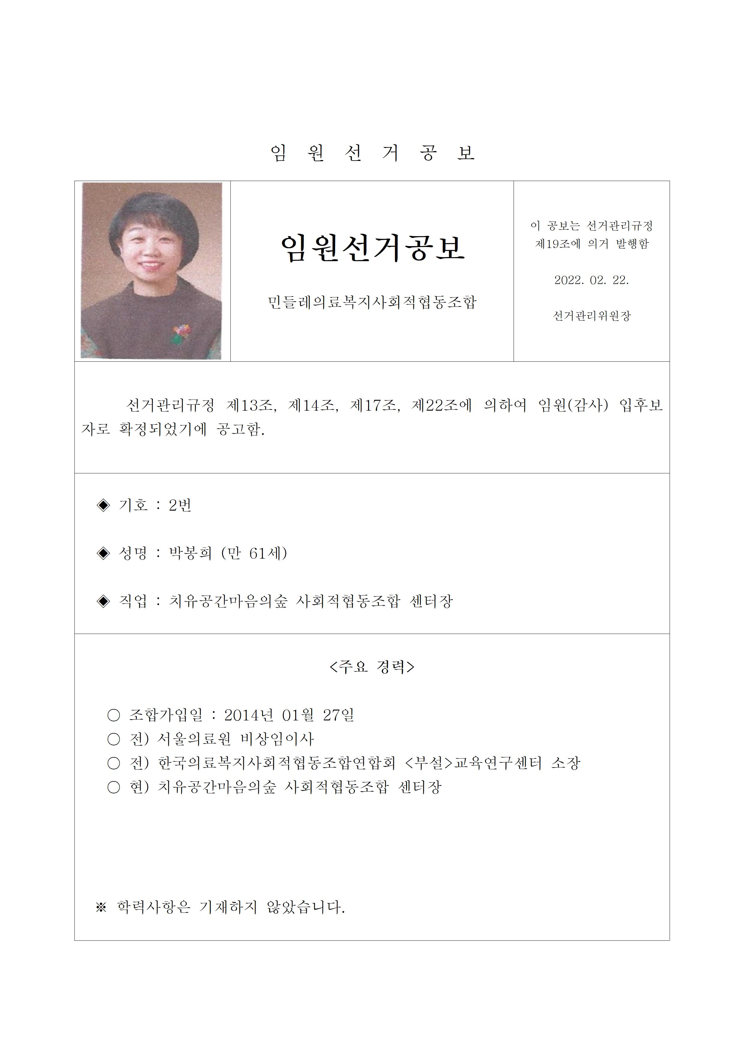 2022년 민들레의료사협 임원(이사, 감사)선거 공보 상세내용