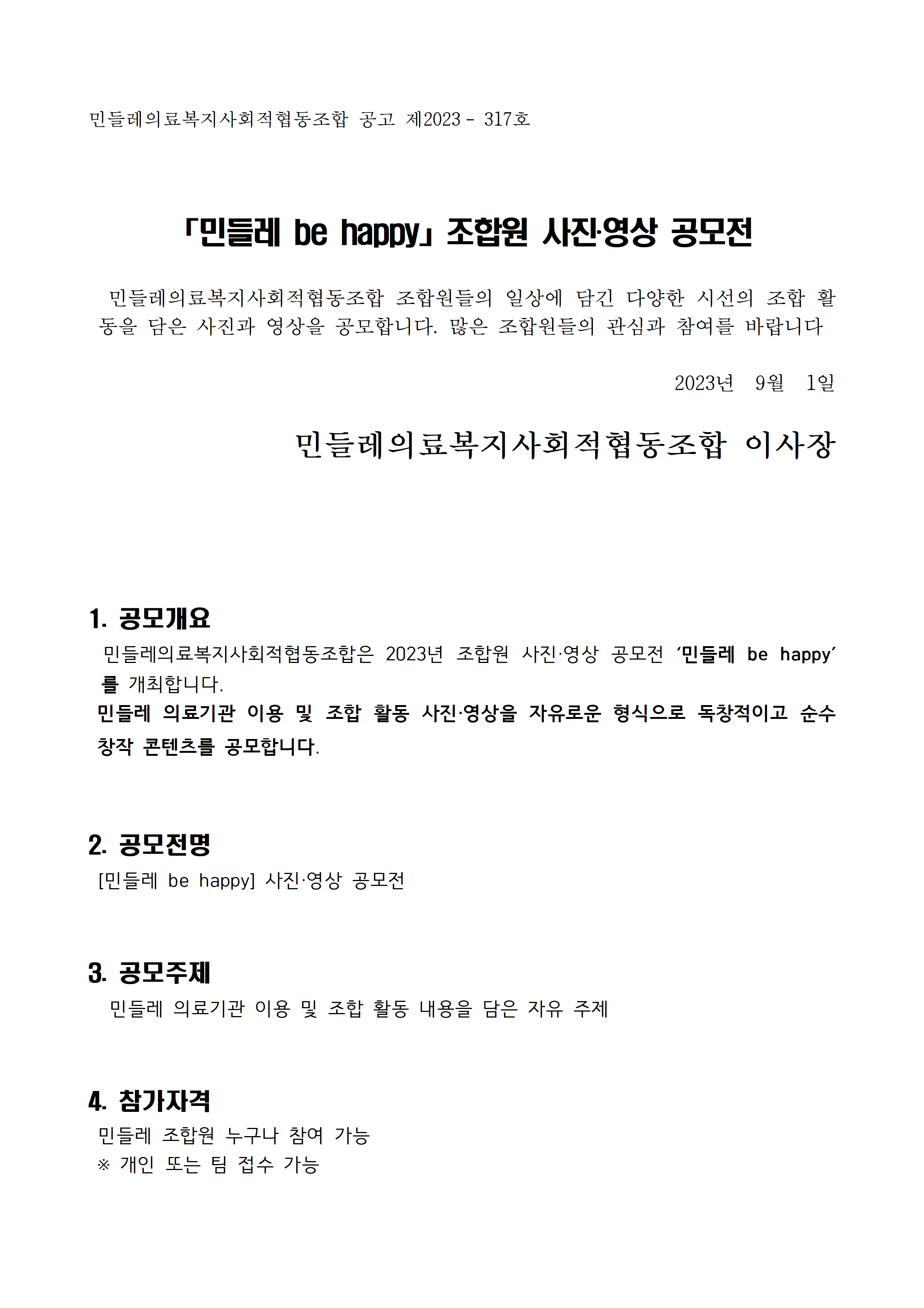 「민들레 be happy」조합원 사진‧영상 공모전 안내