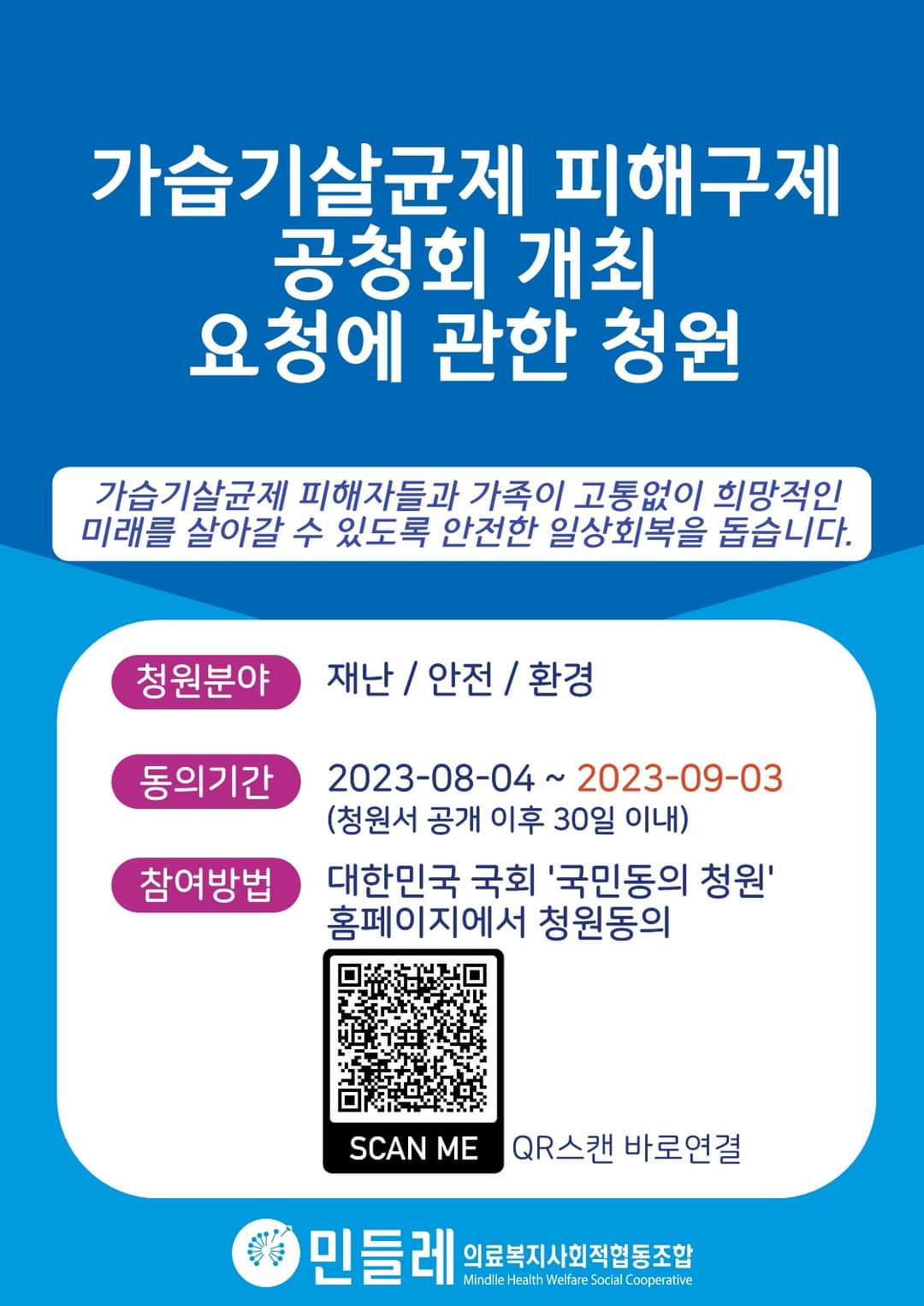 일전에 요청드렸던 «가습기살균제 피해구제 공청회 개최 요청에 관한 청원»이 지난 9월4일 종료되었습니다.