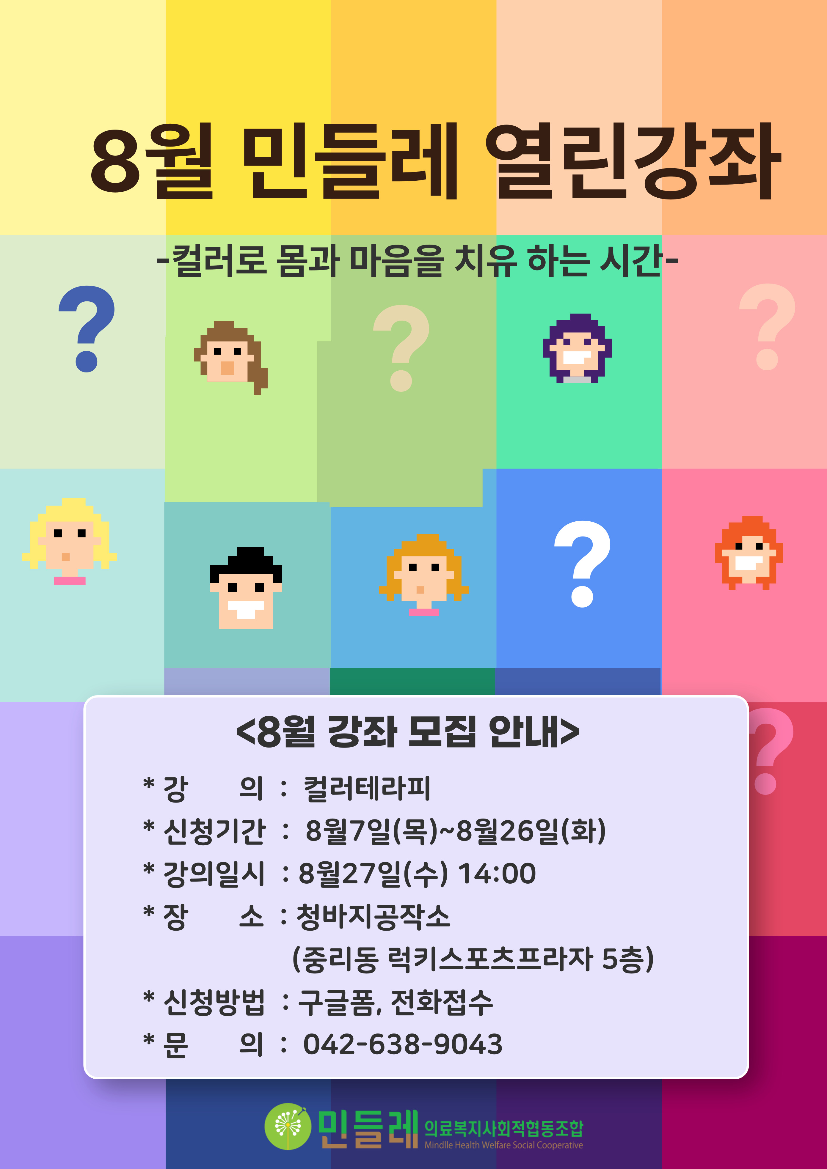 8월 민들레 열린강좌는 '컬러테라피'에 대한 강의가 진행됩니다.