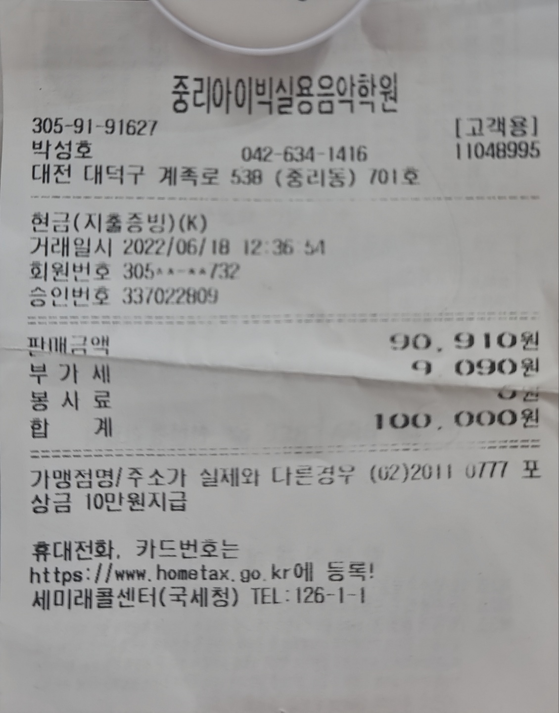 중리아이빅실용음악학원 / 2022. 06. 18 / 연습실대여비 / 100,000원 (2번 기준)